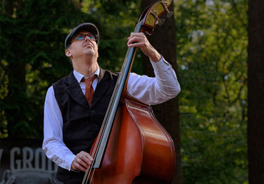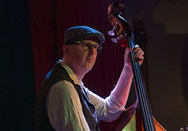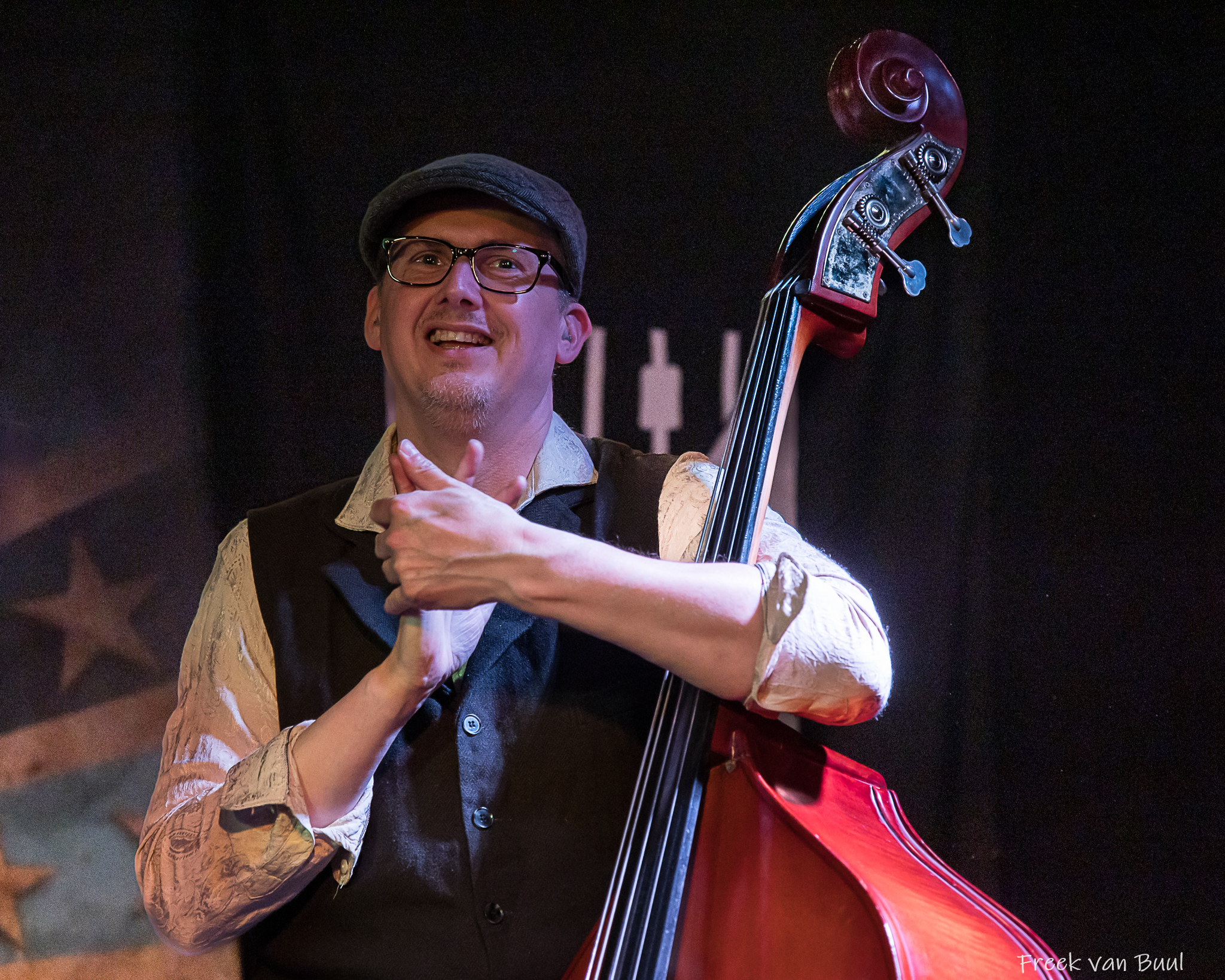 Stuwen, duwen, trekken. Alles in dienst van de groove. Christiaan legt met zijn contrabas het fundament onder de muziek.